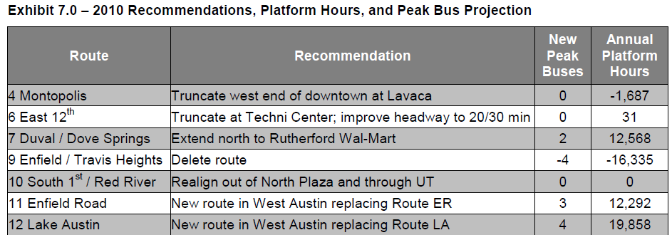 Short and sweet: Here’s two images from the 2010 implementation plan for the 2020 service plan changes. Make sure your browser is wide enough to see the column titled “Annual platform hours”. Or just click on them.